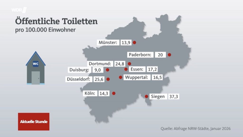 👉 Die IFH-Studie zum Thema „Vitale Innenstädte“, der ich vergangenen Oktober im Rahmen des IHK Handelstags in Dortmund (Schwerpunkt Sicherheit, Sauberkeit und Aufenthaltsqualität) einmal mehr begegnet bin, gibt ein ziemlich klares Bild, dass Menschen in einer Innenstadt öffentliche Toiletten erwarten. Öffentliche Toiletten teilen sich den ersten Platz mit der Erwartung an Maßnahmen gegen Leerstand. In einem Bericht über öffentliche Toiletten in der Aktuellen Stunde landete Duisburg kürzlich auf dem letzten Platz.
