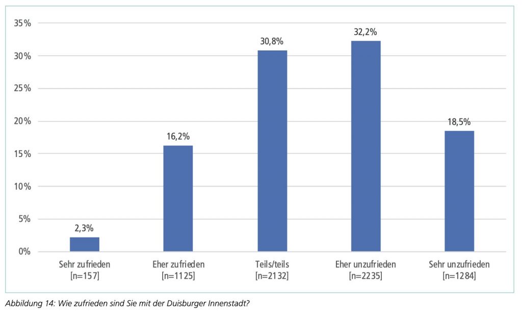 👉 Apropos Studien: In der Bevölkerungsumfrage der Stadt Duisburg für das Jahr 2024 fällt auf, dass das Thema Innenstadt nur noch indirekt Erwähnung findet – nachdem der thematische Schwerpunkt in der Umfrage von 2022 u. a. noch auf der Nutzung und Entwicklung der Innenstadt lag.