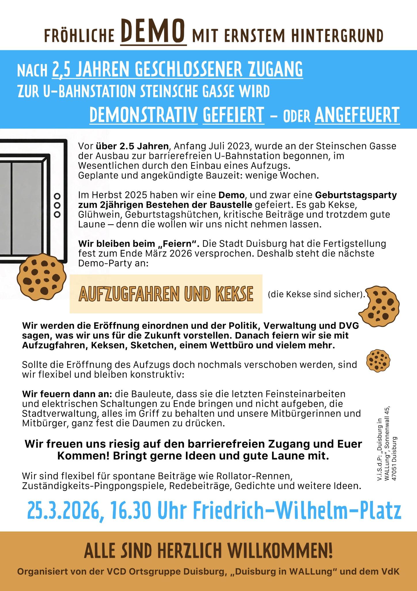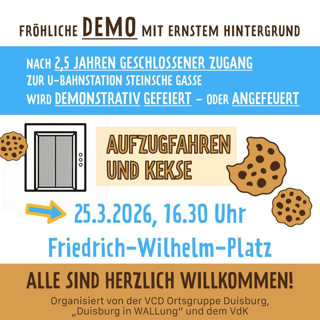 Wir behalten die Fortschritte weiter im Auge. Zusammen mit dem VdK und VCD werden wir am Mittwoch, den 25. März ab 16 Uhr schon mal ein bisschen vorfeiern oder, falls nötig, anfeuern. Nach der gelungenen und heiteren Glühweinparty im November folgt nun das Zusammenkommen mit dem Motto „Aufzugfahren und Kekse“.